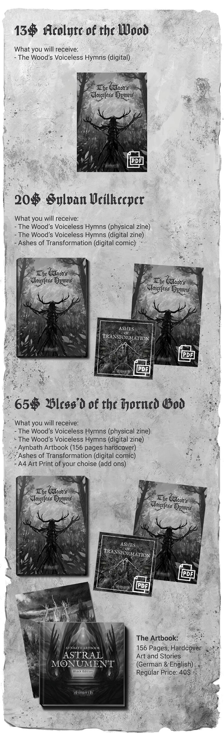 The Wood’s Voiceless Hymns are part of the Aynbath universe, created by luminary artist Aerozopher. Learn more about this world of mystical dark fantasy and rebirth at aynbath.com. The website includes free-to-read webcomics, illustrated adventures and an art gallery with descriptions and short stories.